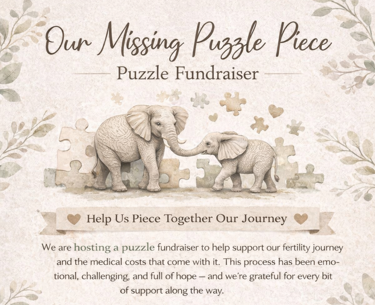 Still, our commitment to each other and to becoming parents has never wavered. We are hosting a puzzle-themed fundraiser to represent the piece we are still missing — our child — and to help support the medical costs that come with continuing fertility treatment and testing. This journey has been emotional, challenging, and full of hope, and we are deeply grateful for every bit of support along the way.